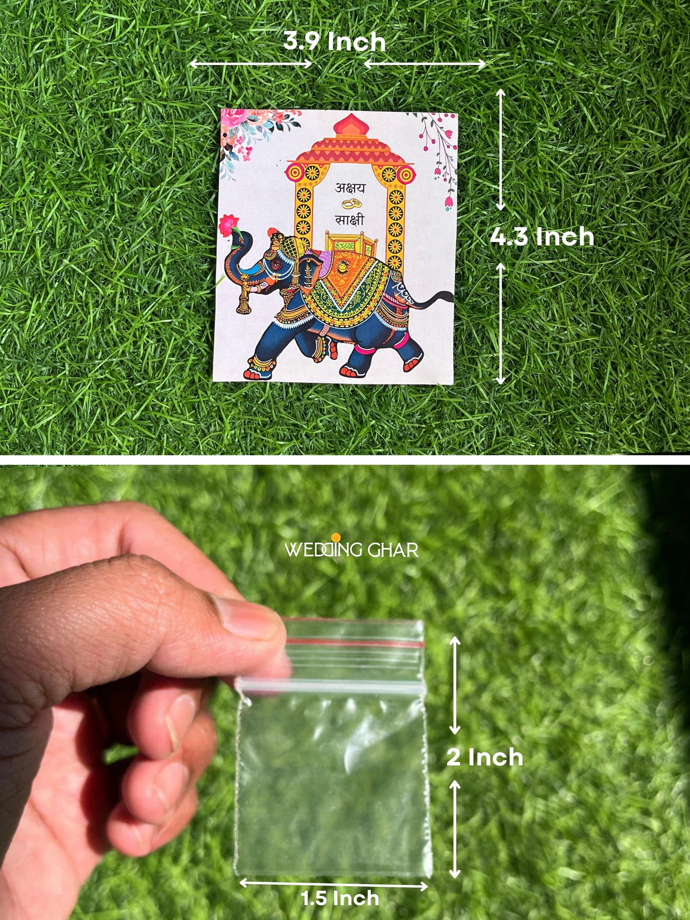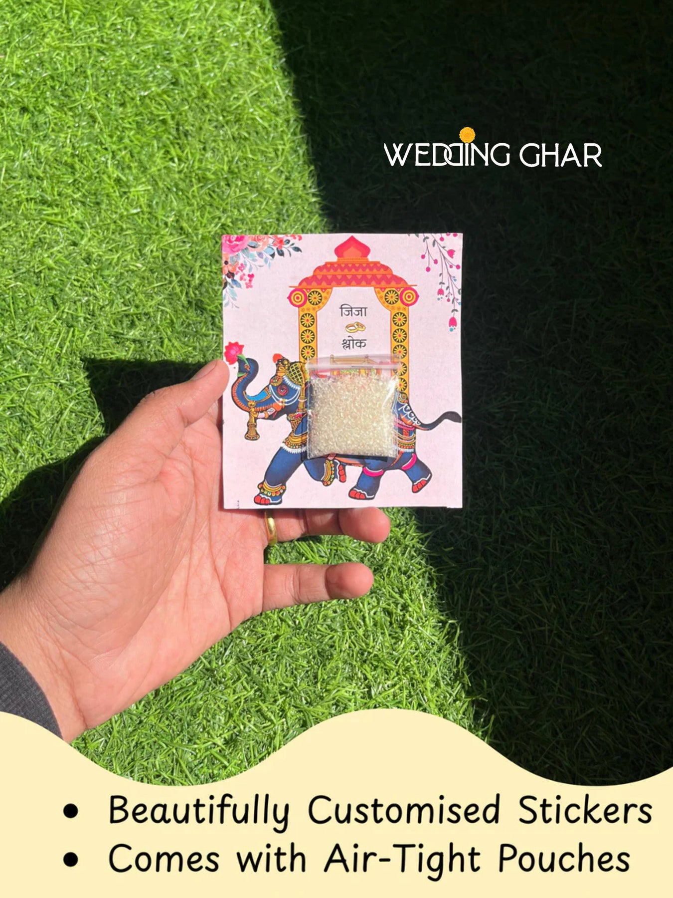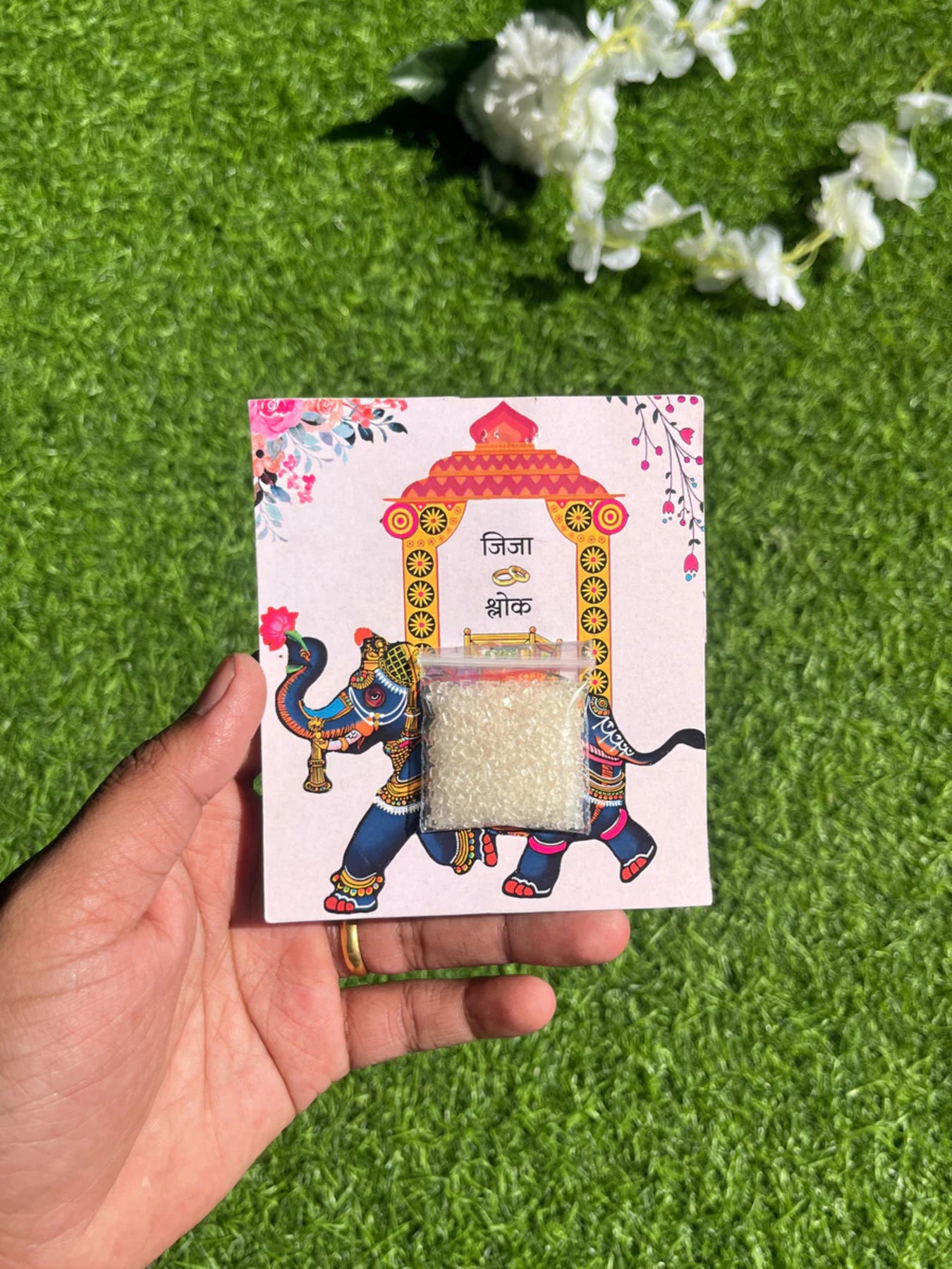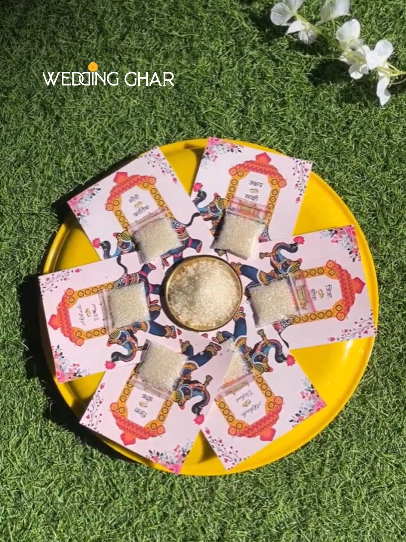 You can easily attach a small sugar sachet to the card with a stapler — or even add a pedha — and distribute sweets hassle-free and neatly to your wedding guests.