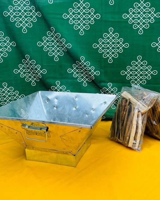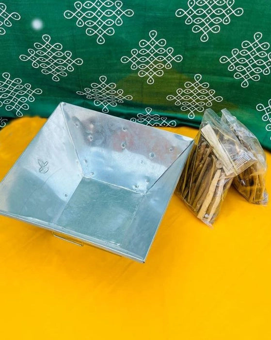 This is a small, square-shaped metal container that is used to hold the sacred fire during the Havan ceremony.